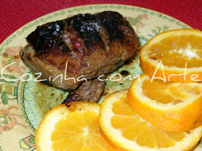 tempere o magret de pato com sumo de laranja e uma pitada de flor de sal, deixe a marinar aproximadamente 4 horas.